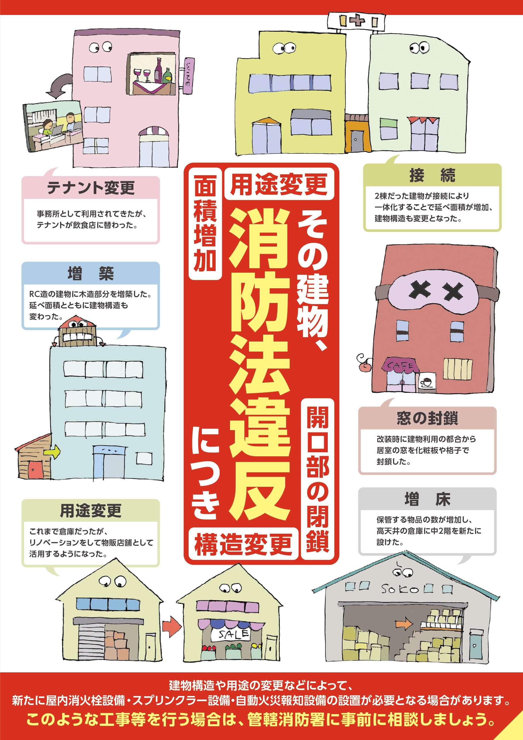 建物構造や用途の変更などによって消防法違反になる場合があることなどに関するリーフレット